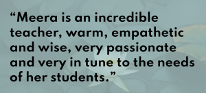 I have attended the workshops run by Meera since 2013. The techniques she has taught me has changed my life. They can be used daily in any situation to bring about a sense of calm. Meera is an incredible teacher, very passionate about meditation and very in tune to the needs of her students. The ascension techniques taught by Meera help to go past the stress and humdrum of daily life and bring a sense of inner calm and well being. I use the techniques daily and many people I was on the course with do too. – Meena N.